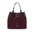 Il design rimane leggero e contemporaneo, arricchito da dettagli in vera pelle che ne sottolineano il carattere sofisticato. La fascia superiore, i manici a spalla regolabili e la base rinforzata, tutti in pelle martellata, creano un contrasto armonioso con la superficie vellutata del suede. Sul davanti, logo in metallo completa il modello con un tocco distintivo.
